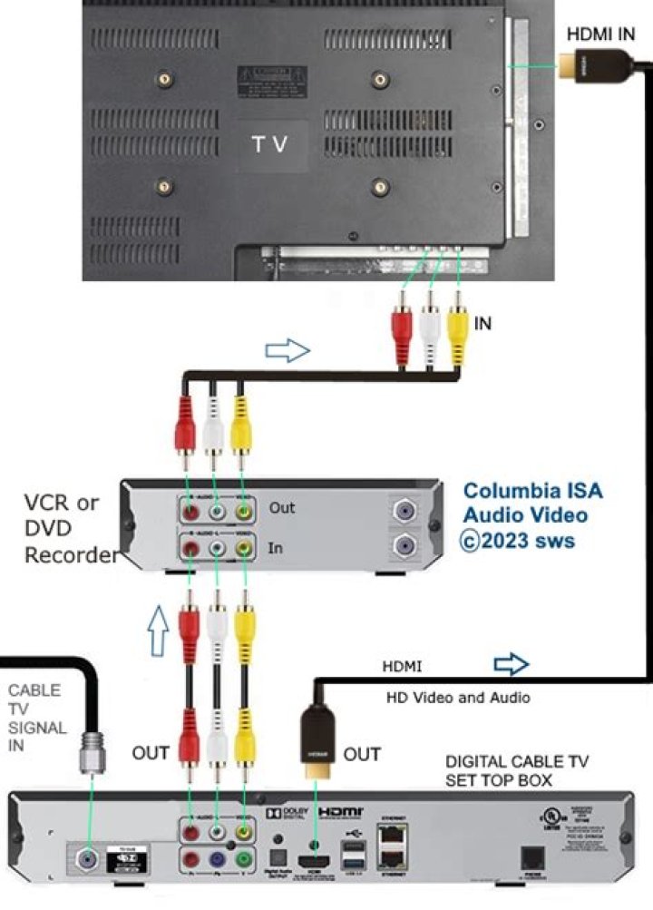 However you can’t connect your VCR directly to the TV. You need a converter box between the VCR and the TV. The yellow, red and white lead from the VCR plugs into the input of the converter box. The output of the converter box connects to a HDMI lead.