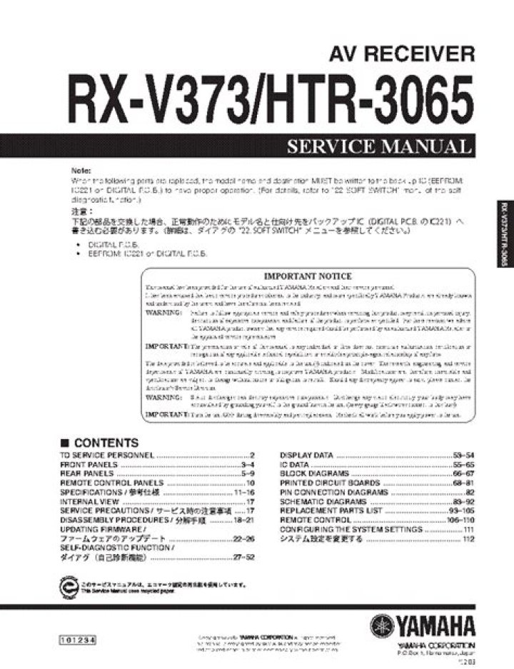 Push the power button, MAIN appear and then turn off. The Service manual talk about updating Firmware but I never found any RXV471-xxxx.bin file anywhere on the internet. Hold TONE CONTROL + INFO + POWER Buttons. Scroll all Main and Sub-Menus. Everything is ok.