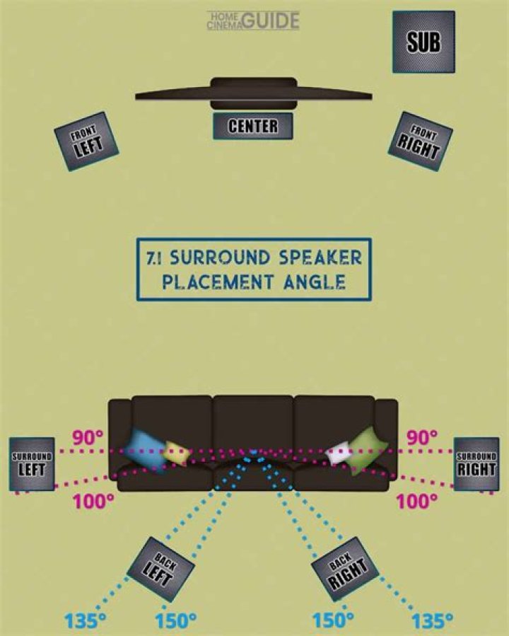 There are two surround speakers for both sides of the room. The speakers are placed beside or slightly behind the listening area, such that sound is angled toward the audience. Back speakers get placed behind the side surround speakers and the listening area.