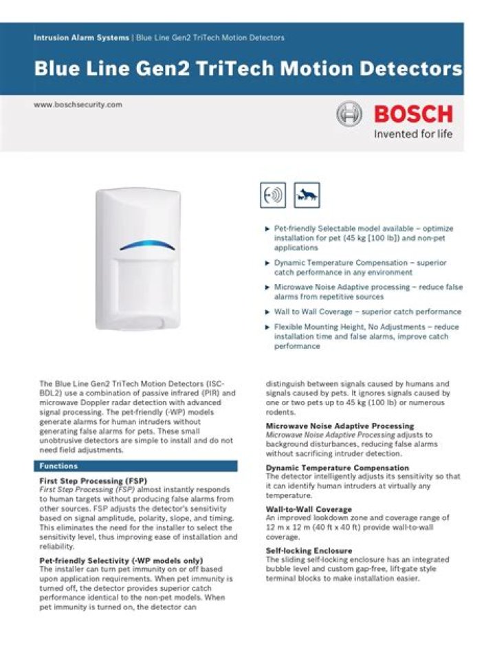 The Blue Line Gen2 TriTech Motion Detectors (ISC-BDL2) use a combination of passive infrared (PIR) and microwave detection technologies with advanced signal processing. These pet-immune models generate alarms for human intruders without generating false alarms for pets.