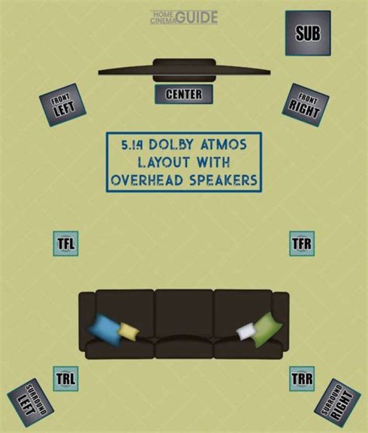 5.1.2 Dolby Atmos-enabled speaker setup. To create an optimal sound system enabled with Dolby Atmos®, first familiarize yourself with the role and position of each speaker. Then choose a central seating point and angle your speakers at it, keeping them at your ear height when you are seated, unless noted otherwise.
