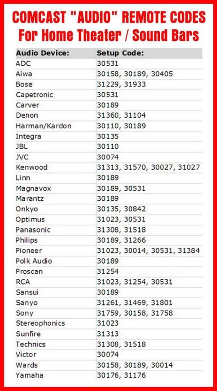 Comcast audio component remote codes. These are the 5 digit remote codes that Comcast has designated as the codes to work for all Home Theaterand Sound Bars. It lists the audio device manufacturer and the setup code to program it.