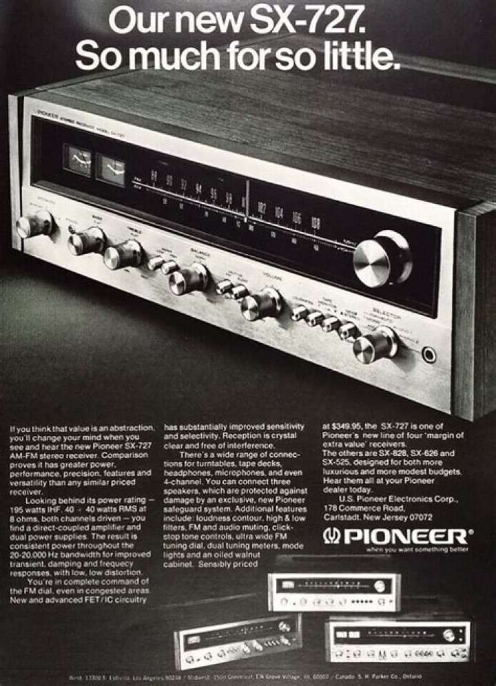 Upper range power output, unusual FM selectivity and sensitivity and the versatility of units costing much, much more – the SX-727 stereo receiver from Pioneer puts together all of these hi-fi virtues and offers the music enthusiast a new high in stereo value.