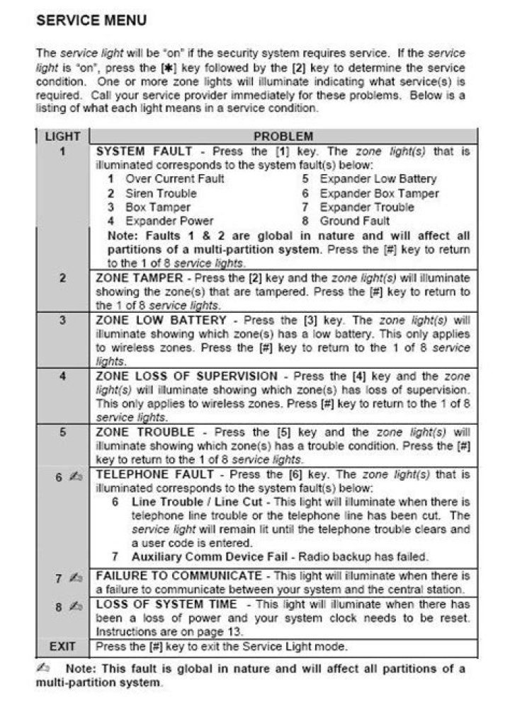 SERVICE MENU The service light will be “on” if the security system requires service. If the service light is “on”, press the [r] key followed by the [2] key to determine the service condition. One or more zone lights will illuminate indicating what service (s) is required.