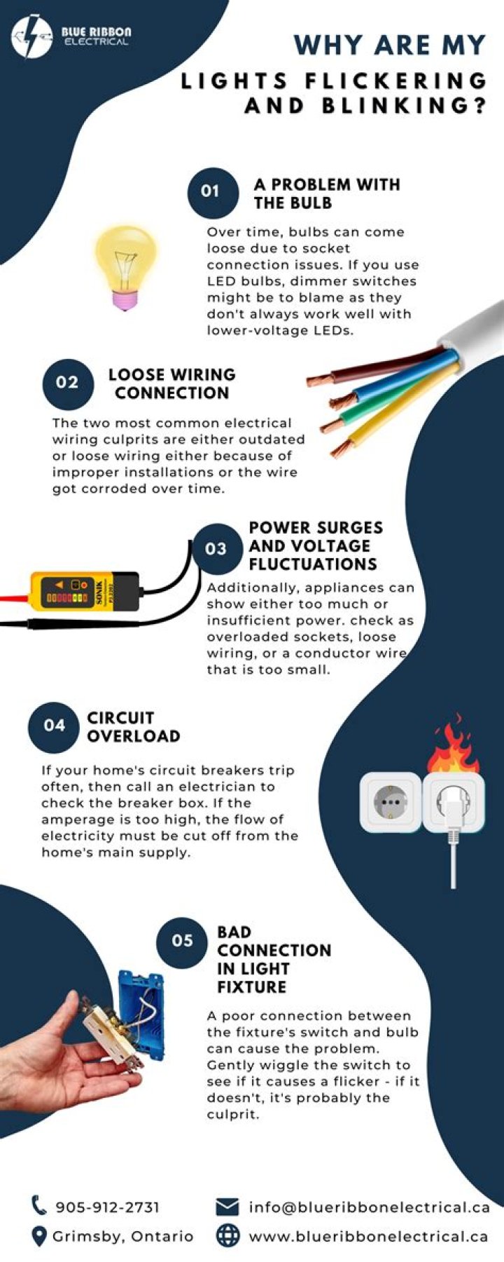 Flickering or blinking lights are usually caused by one of the following: Problem with the bulb (not in tight enough, lightbulbs are incompatible with your dimmers) Faulty switch or dimmer. Appliances or HVAC units pulling large amounts of current on startup, causing a voltage drop.