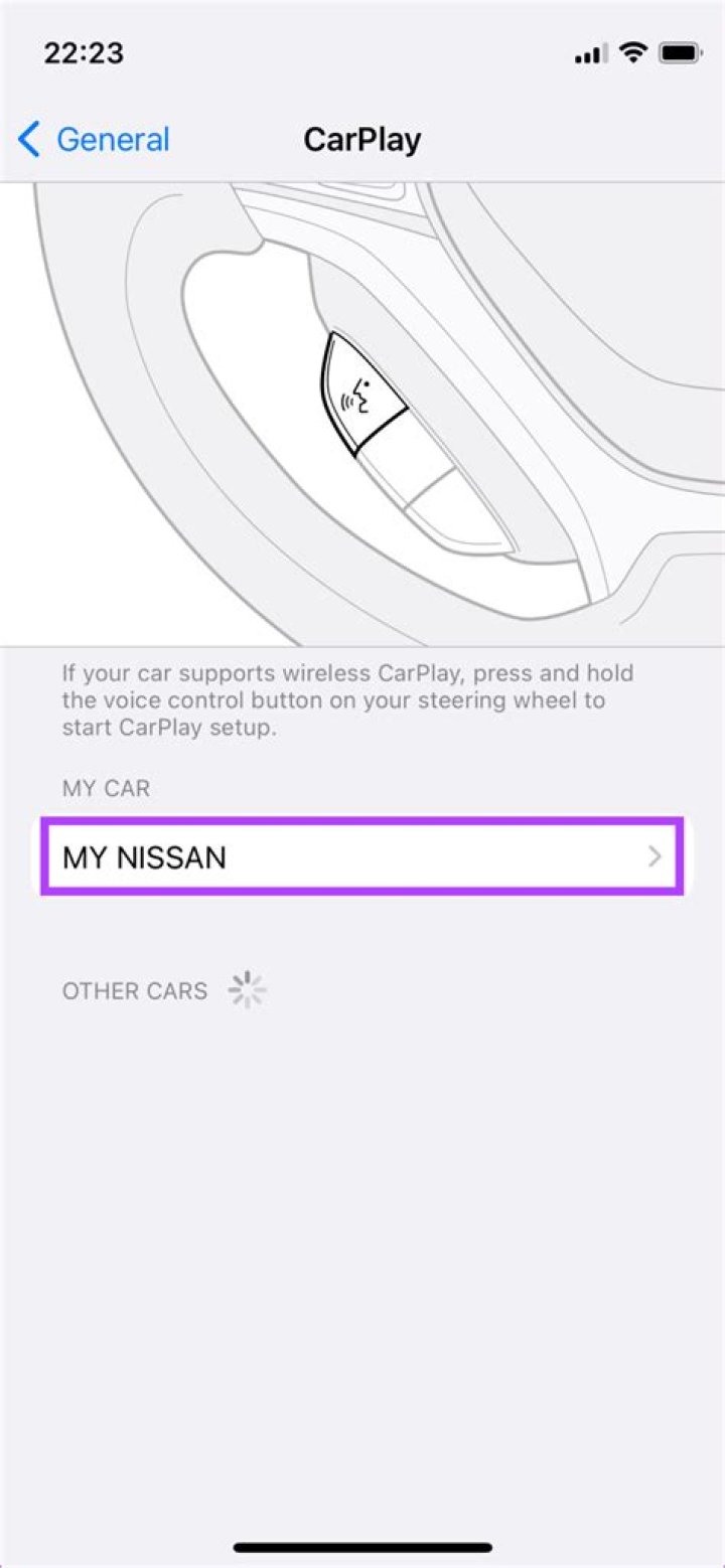 If your car supports wireless CarPlay, press and hold the voice-command button on your steering wheel. Make sure that your stereo is in wireless or Bluetooth mode. Then on your iPhone, go to Settings > General > CarPlay, tap Available cars, then select your car. Check your car manual for more information.