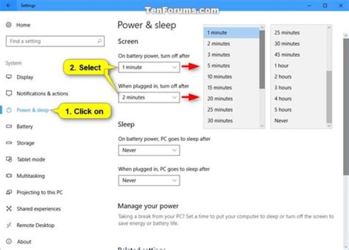 To Change Turn Off Display After Time in Power Plan Settings 1 Open your power plan settings. 2 To the right of Turn off the display, select how many minutes you want to turn off the display (s), and click/tap on Save changes when finished. (see screenshot below) If you PC doesn’t have battery power, then you will only see one option.
