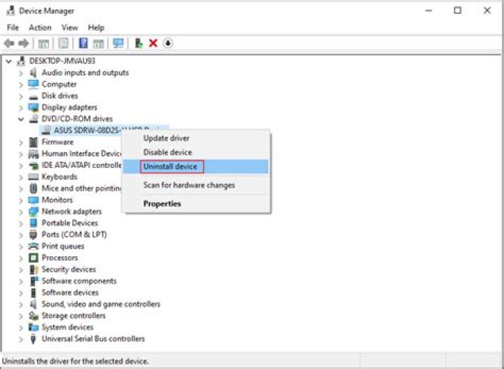 In the Device Manager window, expand DVD/CD-ROM drives. Right-click the CD/DVD/Blu-ray drive that is listed, and then click Uninstall. Click OK to confirm that you want to remove the device. Restart your computer (Once the restart is complete, the Operating System will automatically install the required drivers).